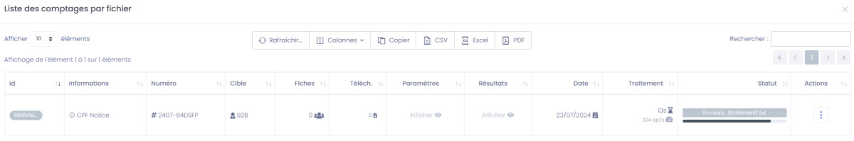 Dans l'onglet "Fichiers" du menu supérieur, vous pouvez retrouver la liste des différents traitements de fichiers réalisés depuis votre compte, et suivre leur état d'avancement, puis les résultats une fois le traitement finalisé.