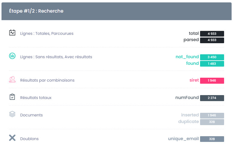 • Résultats totaux : détaille le total brut des enrichissement retrouvés (avant déduplication)