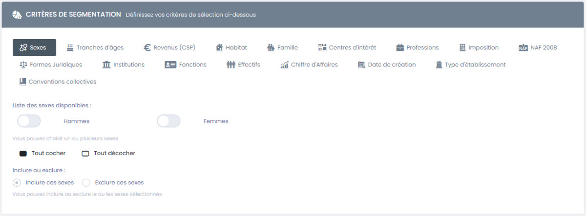Cette catégorie permet de cibler les profils selon les caractéristiques de leur établissement, leur activité ou leur profil (critères B2B et B2C).