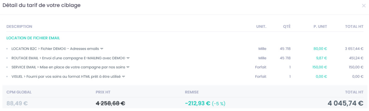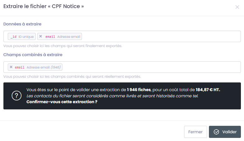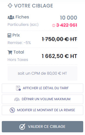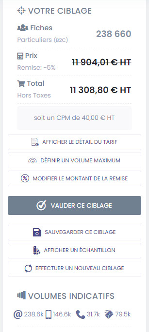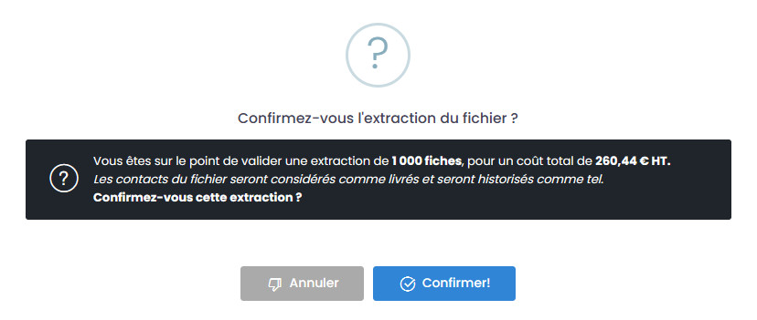 Une fois confirmé, cette sélection sera facturée, les données extraites seront facturées selon volumes, usage défini (disposition des fiches) et canaux de communication sélectionnés.