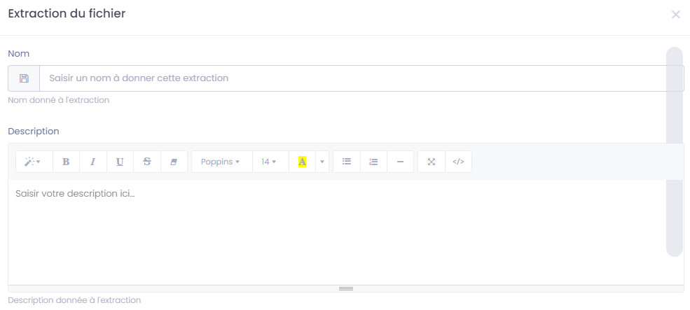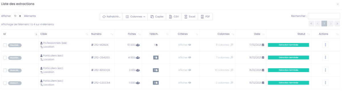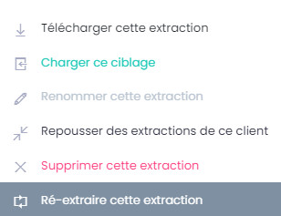 Cette fonctionnalité permet de lister les extractions réalisées, de les télécharger, de les mettre en repoussoir d'une nouvelle sélection, de les déclarer comme détruites après utilisation ...