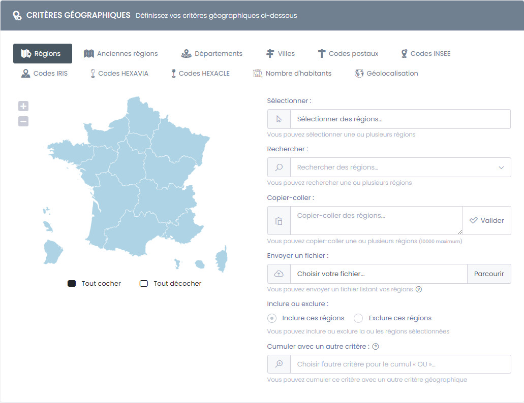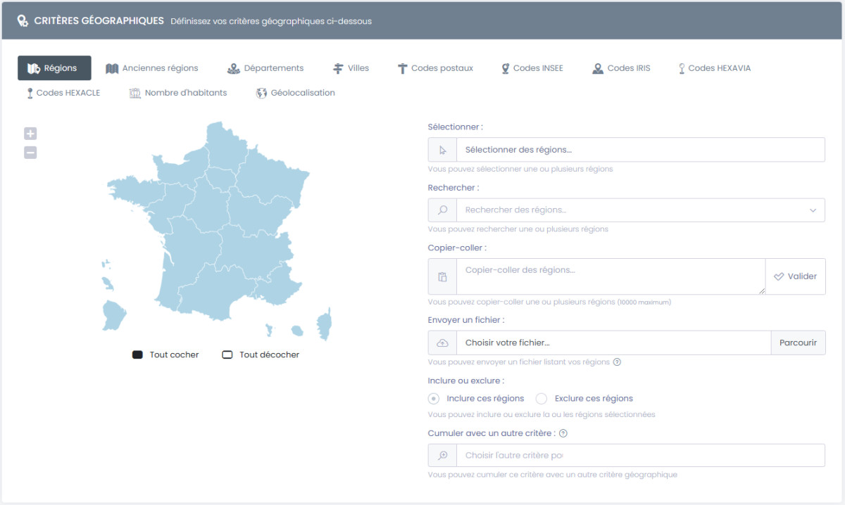 • Régions : permet de cibler géographiquement par régions, avec les nouvelles nomenclatures et délimitations