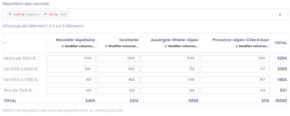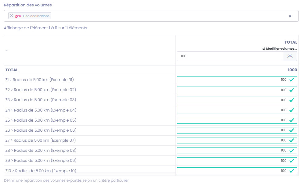 Optionnel : Vous pouvez également définir une ventilation personnalisée des contacts à extraire par zones geo ciblée lors de l'extraction (pour sélectionner par exemple un nombre de contacts identiques sur chaque secteur ciblé) :