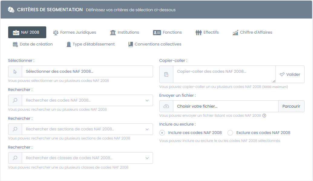 • NAF 2008 : permet de cibler les profils à partir de leur classification NAF (Nomenclature des activités françaises).