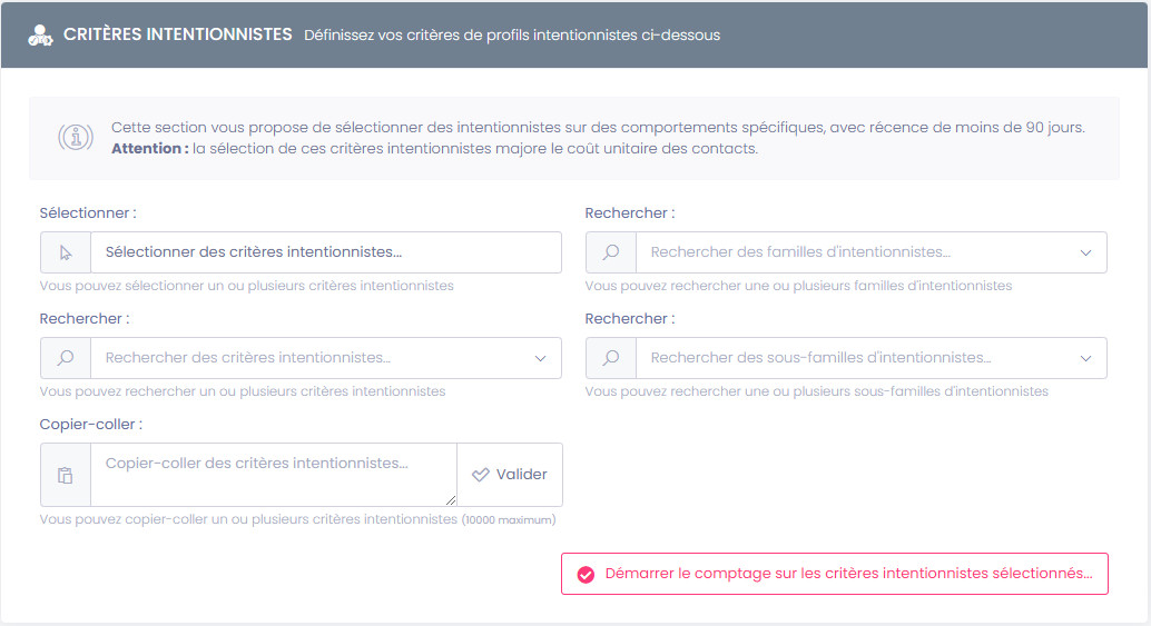 Cet espace permet de réaliser des comptages, des ventilations, des devis et d'extraire une sélection de contacts ciblés de particuliers, entreprise et Décideurs ciblés à la fonction (email / mobile / fixe / postal) à partir des critères que vous aurez sélectionné.