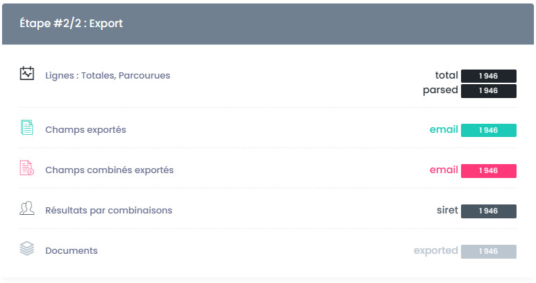 • Champs exportés : détaille le volume de données exportables par champs à extraire sélectionnés lors du paramétrage de votre enrichissement.