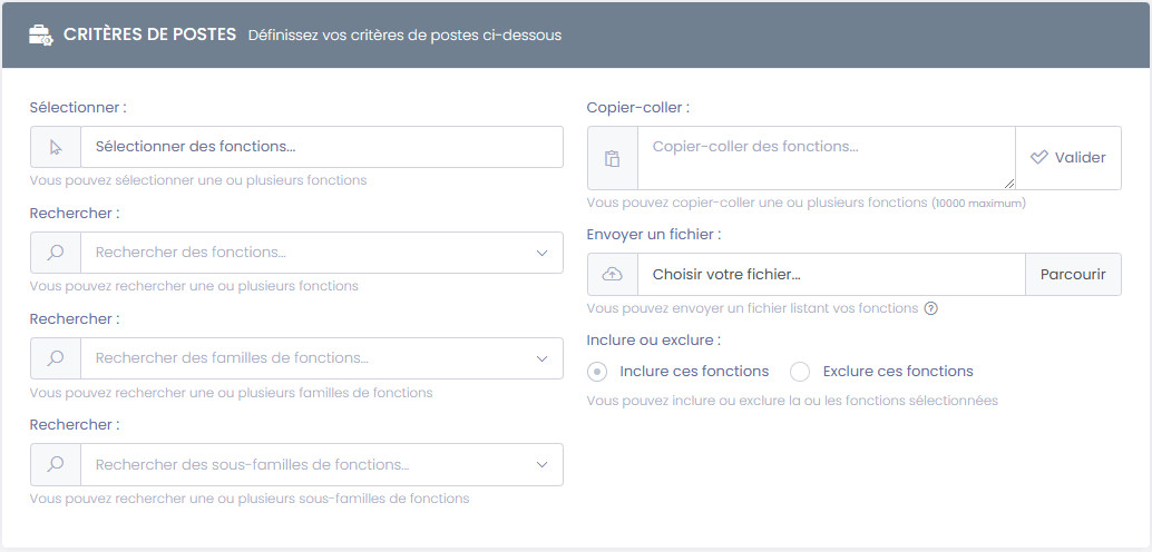 • Fonctions : permet de cibler les profils en fonction de leur service ou poste occcupé dans l'entreprise ciblée (note : la tarification Décideurs sera appliquée automatiquement si un critère est activé dans cet onglet)