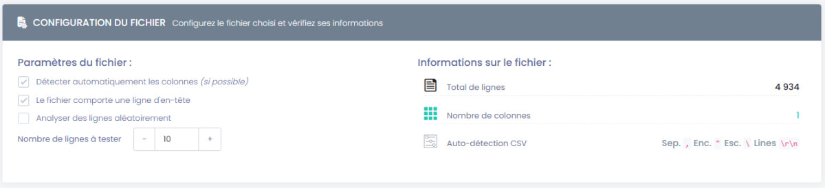L'outil va lancer une détection automatique des champs du fichier importé, comptabiliser le nombre total de lignes et de colonnes, et détecter le format d'encodage du fichier.