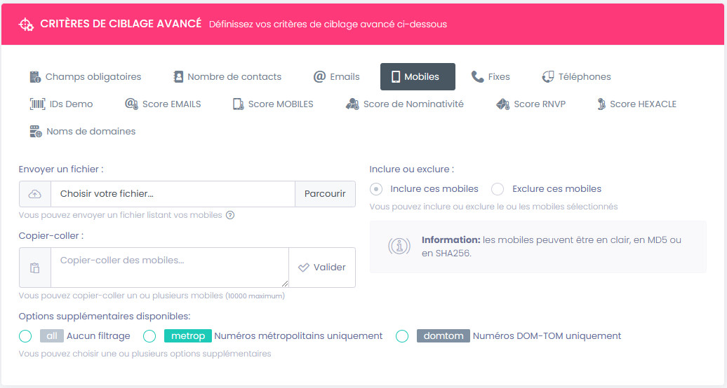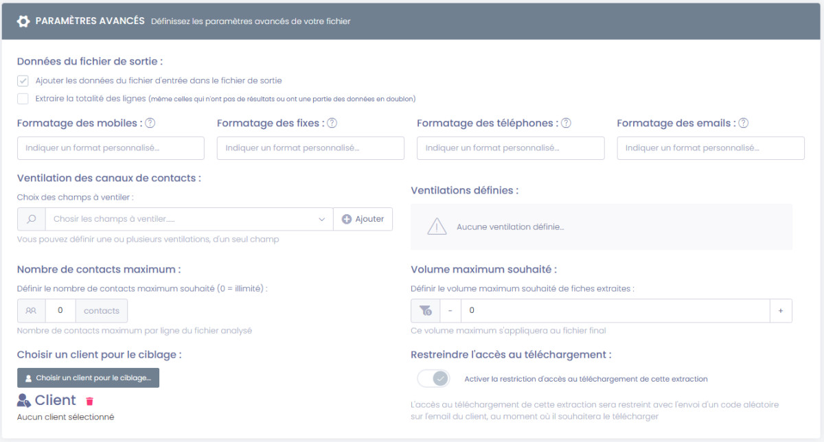 • Formatage des données : permet de définir un format précis pour les champs mobile / fixe / téléphone ou email à extraire