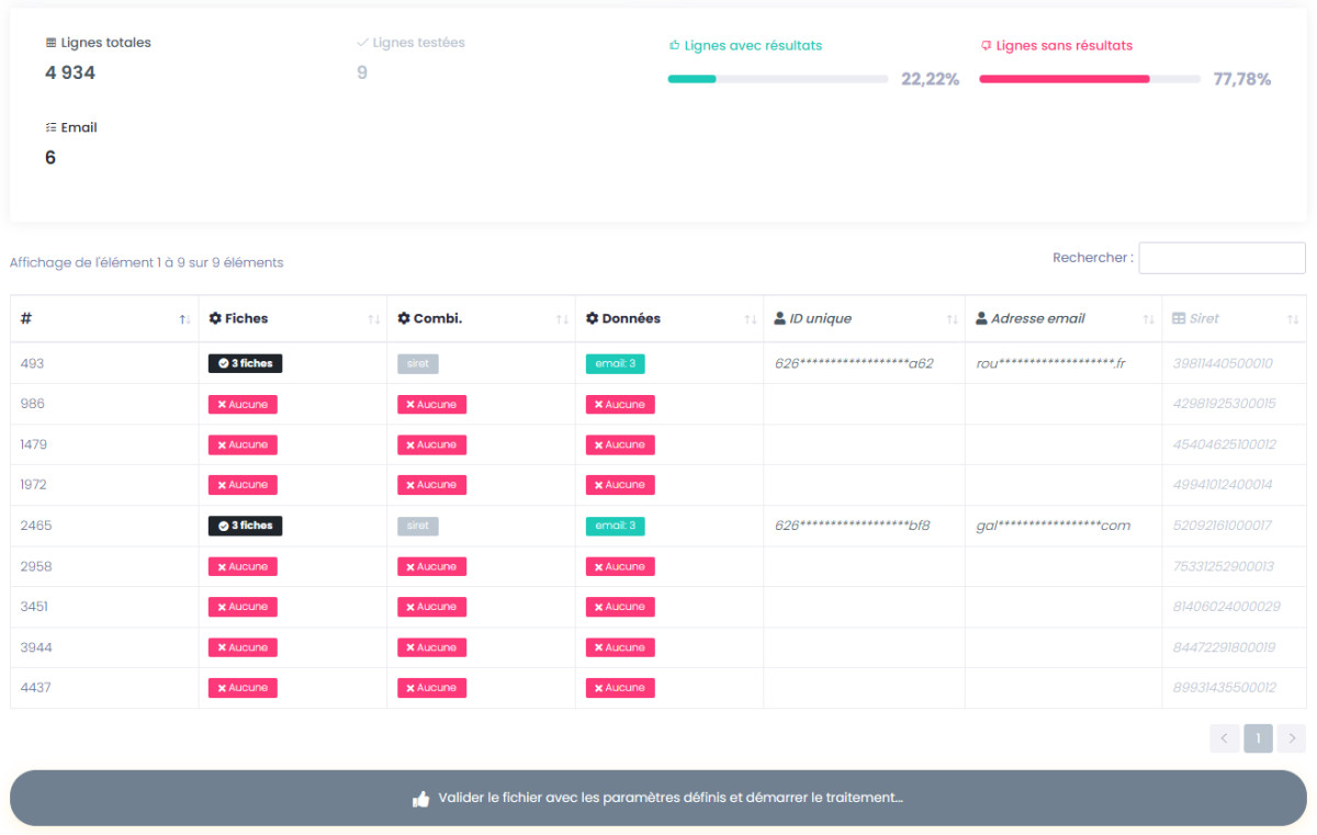 A cette étape, aucune donnée n'est facturée. Les volumes sont donnés à titre indicatif, par rapport au fichier d'entrée inséré, et aux résultats retrouvés d'après les combinaisons de recherche sélectionnées.