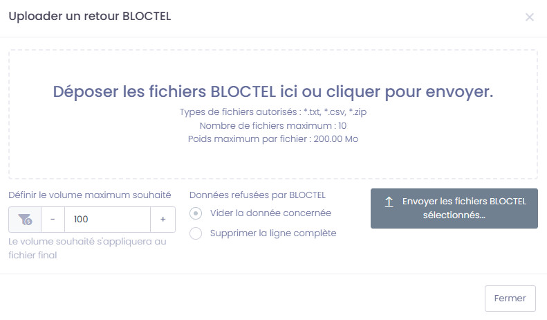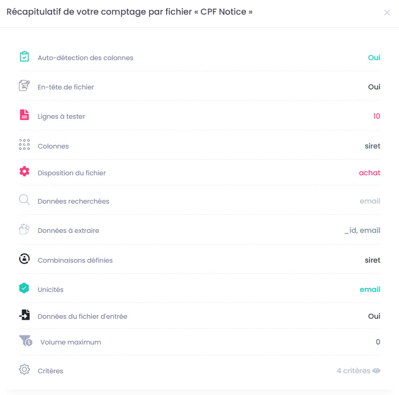 A cette étape, aucune donnée n'est facturée. Les volumes sont donnés à titre indicatif, par rapport au fichier d'entrée inséré, et aux résultats retrouvés d'après les combinaisons de recherche et critères sélectionnés.