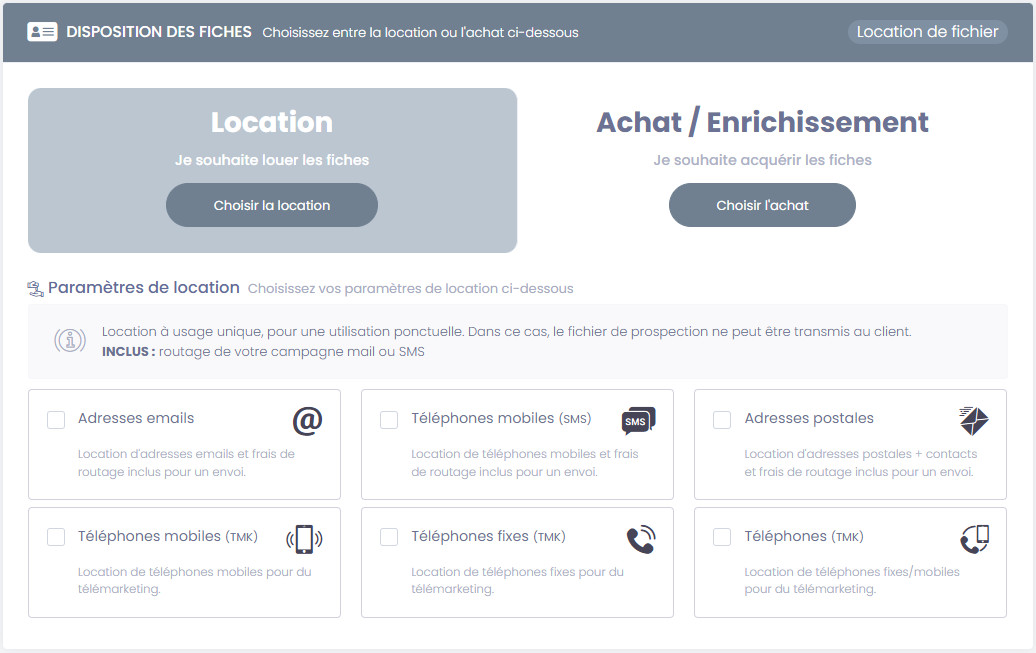 • La location est destinée à un usage unique des données, routage inclus (Email, SMS, Postal), ou Télémarketing.