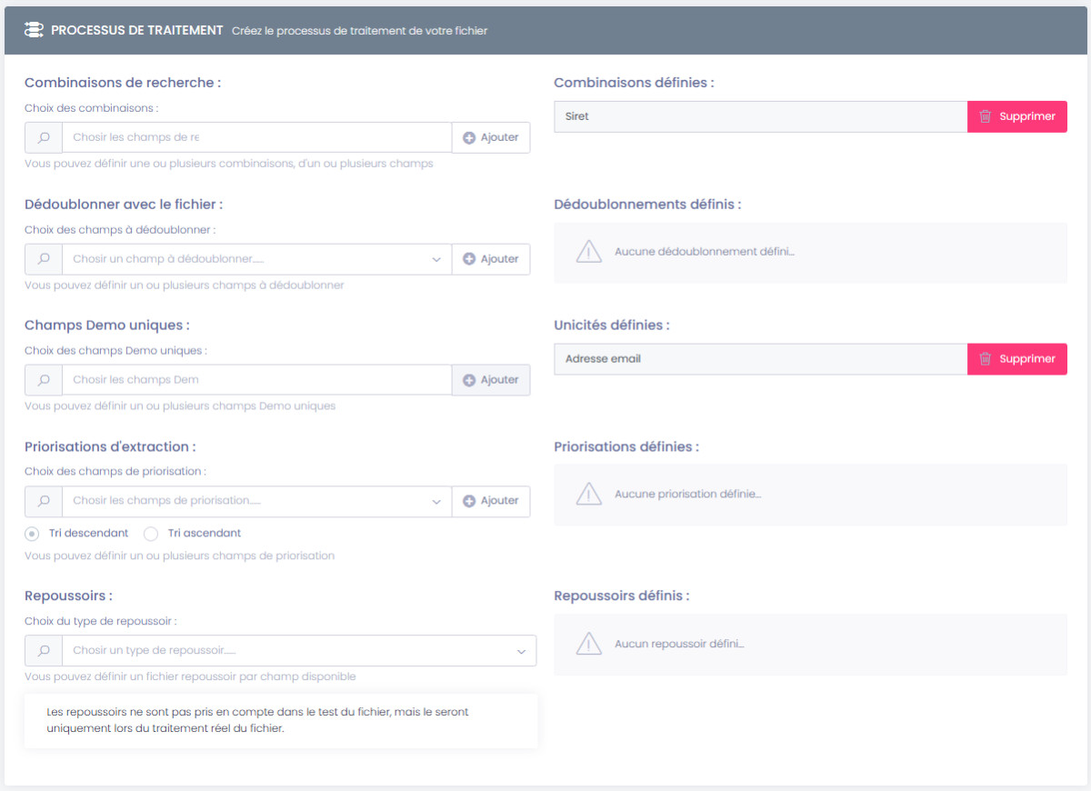 Ces différentes étapes du processus permettent de définir les règles d'enrichissement du fichier. Les critères non nécessaires à l'enrichissement réalisés doivent rester vide pour ne pas surcharger inutilement le traitement.