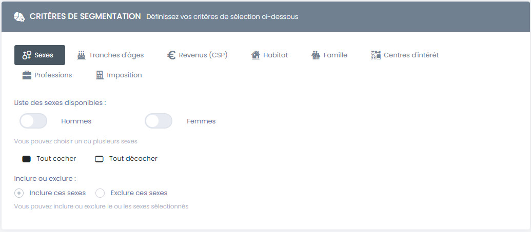 • Revenus (CSP) : permet de cibler les profils par revenus / CSP