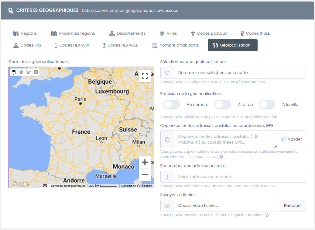 Plusieurs critères géographiques peuvent être sélectionnés dans différents onglets.