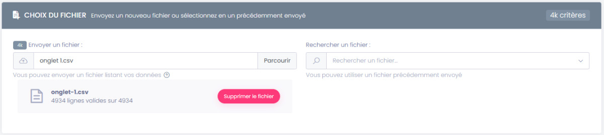 Vous pouvez importer un nouveau fichier à enrichir, rechercher un fichier déjà importé préalablement, ou effectuer un comptage avancé sans fichier d'entrée.