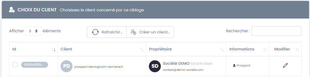 • Choisir un Client : cette option, réservée aux utilisateurs ayant un statut Commercial ou Administrateur, permet d'associer l'enrichissement à un client précis.